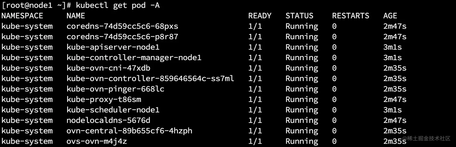 通过kubectl get pod -A能看到 Kube-OVN 相关的 Pod 已经都正常运行