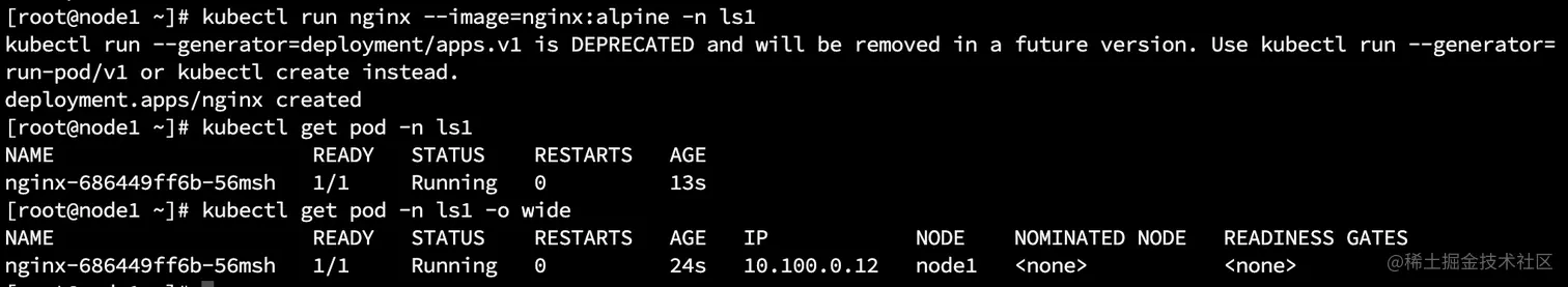 创建 Nginx Pod 并绑定 ls1 `kubectl run