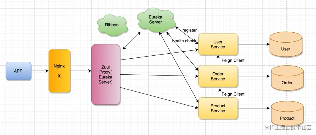 所有请求都统一通过 API 网关(Zuul)来访问内部服务。