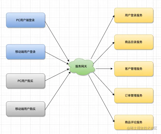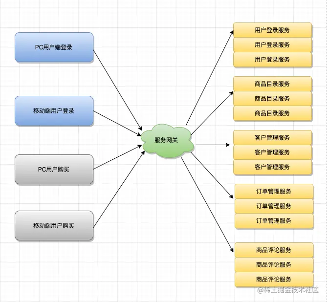 但通过观察上图容易发现,当服务数量增多时,服务调用关系变得复杂。为系统添加一个新功能,要调用的服务数也变得不可控,由此引发了服务管理上的混乱。所以,一般情况下,需要采用服务注册的机制形成服务网关来进行服务治理。系统的架构将变成下图所示: