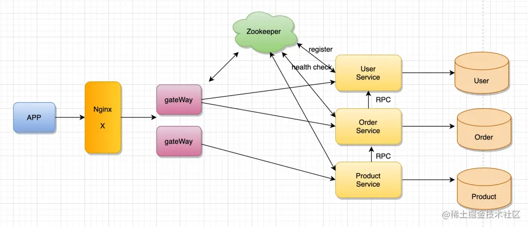 每个组件都是需要部署在单独的服务器上,Gateway 用来接受前端请求、聚合服务,并批量调用后台原子服务。每个 Service 层和单独的 DB 交互。
