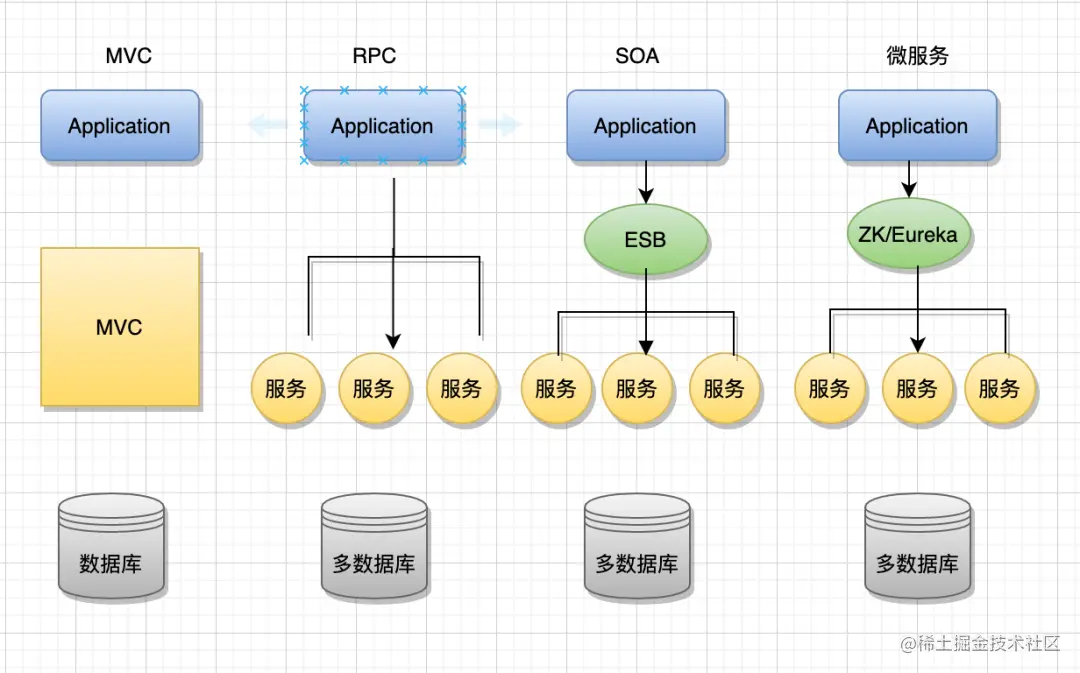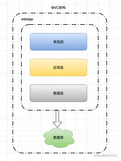 MVC 架构就是一个单体架构。我们常使用的技术:Struts2、SpringMVC、Spring、Mybatis等等。