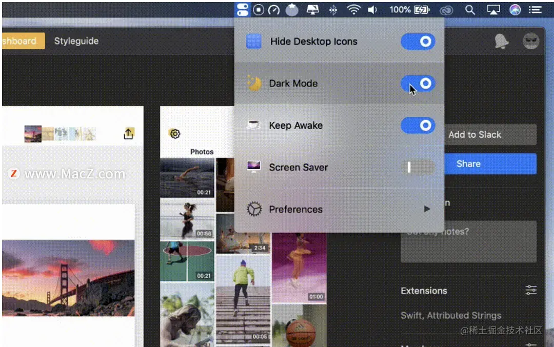它在Menubar菜单里集成了隐藏桌面(图标)、切换Dark Mode、保持亮屏、开启屏保的一键切换按钮,将以往这些以独立小软件为单位的小功能集成到了一起,方便用户快速调用,实现是方便很多。