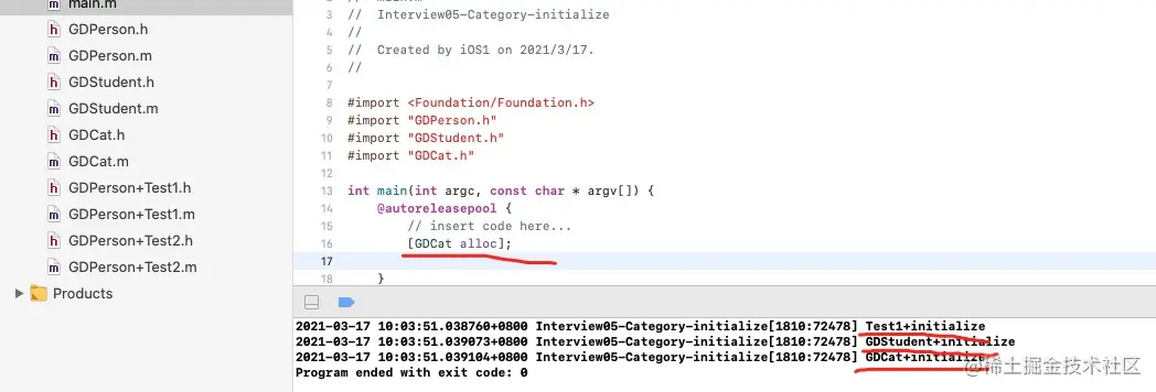 细心的可能发现,这里是不是和我们之前的类方法调用非常像,其实是一样的,它也是通过消息机制来发送的类似objc_msgSend([GDPerson class],@selector(initialize)),根据我们之前的知识知道,如果类和分类方法同名,优先调用分类的方法,而且是后编译的先调用一摸一样(大家可以自己尝试上面的代码,后面我会证明),接下来我们看一下.
