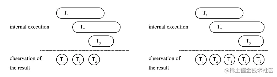 原子性指的是一个事务中的所有操作,要么全部成功、要么全部失败。但是原子性并不能确保事务的过程也是原子发生的,约束事务过程的是隔离性。一个理想的数据库执行多个事务时,从结果看来,这些事务可以看作是顺序执行的,即每个事务的过程也是原子发生的。图 1 展示了是否可序列化在外部观测的区别,左图表示的是从结果看来,可以将看成是按照顺序完整执行了 T1 -> T3 -> T2;但是在右图中,T1 的执行过程中掺入了 T2 的执行,T2 的执行过程中掺入了 T3 的执行,即发生了语义上的非 serializable。在这种情况下,隔离级别定义的是数据库事务间的隔离程度。