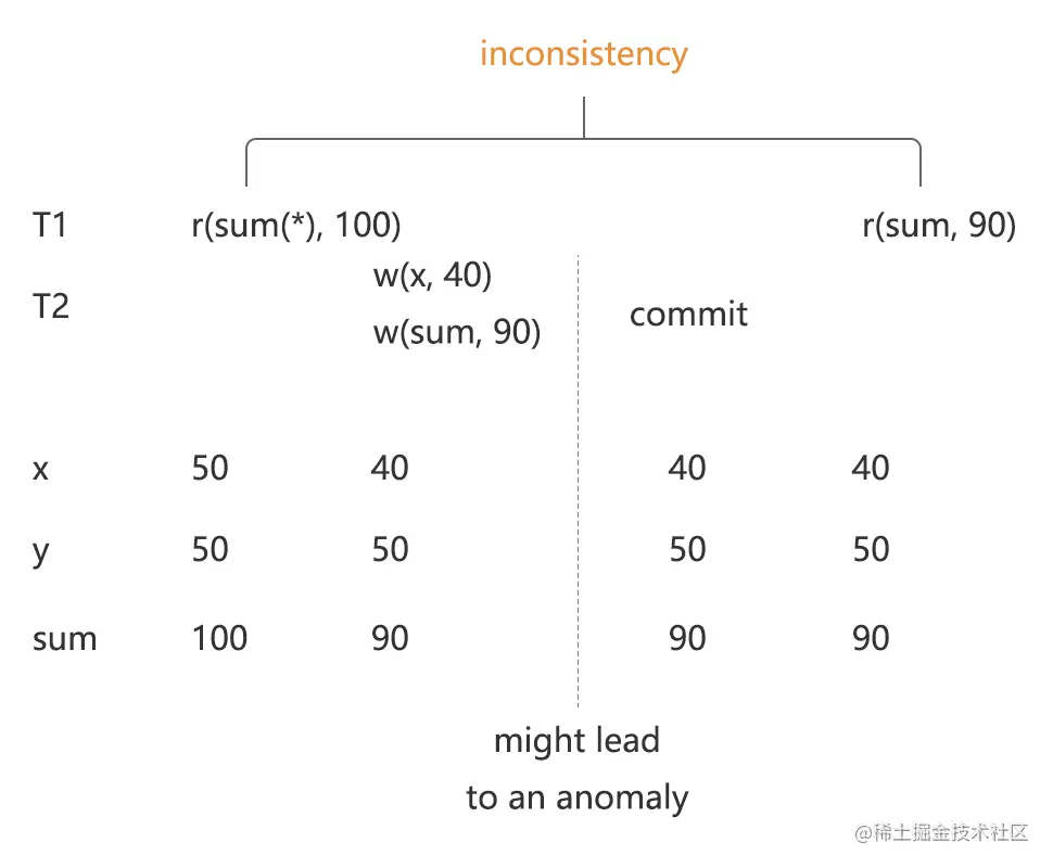 和 ANSI SQL-92 所定义的 Phantom Read 不同,这篇文章把这一异常现象称为 Phantom,例 11 列举了标准的 Phantom Read,其特点是需要两次 predicate 类型的读操作读到了不同的数据。Phantom 现象比 Phantom Read 的定义要更加广一些,如例 12 所示,Phantom 现象的扩大解释只要在一个事务进行了 predicate 类型的读取,而另一个事务对其中的某个 key 进行了写操作,就可能出现异常,换言之,predicate 类型的读请求应该阻塞对它所读取到的数据的写请求。图 5 解释了采用扩大解释的原因,并且指出了以一种一个 predicate 和一个 item 类型的读取到的结果不一致的情况,在 Serializable 的数据库下,通过 predicate 类的查询计算 x 和 y 的和应当获得和通过 item 类的查询直接读取 sum 这个 key 一样的结果。