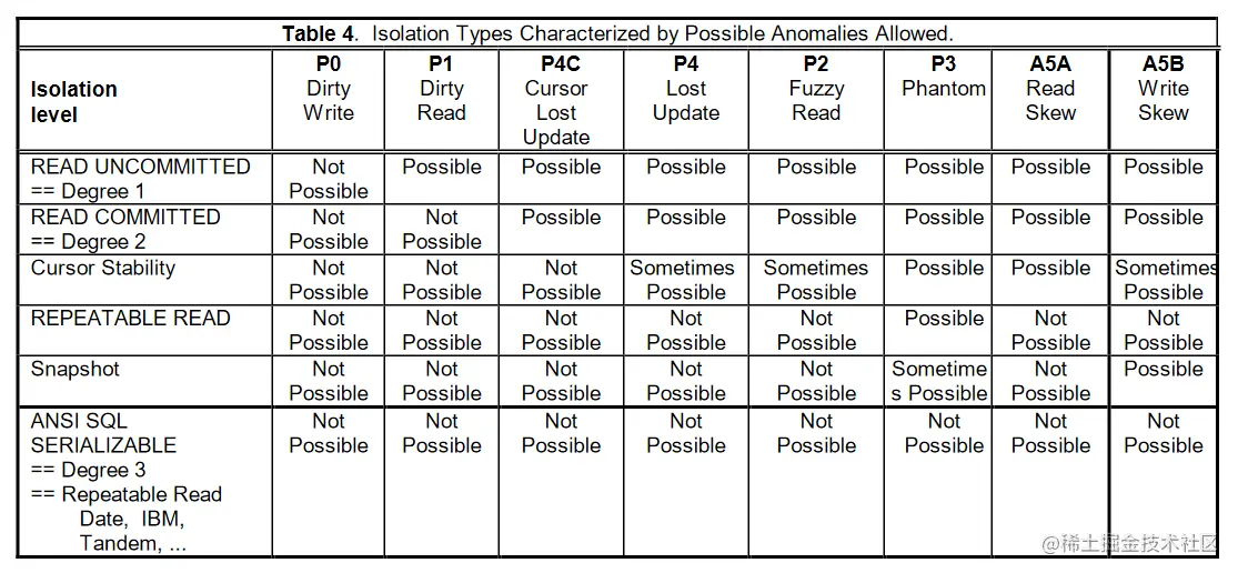 「A Critique of ANSI SQL Isolation Levels」这篇文章指出了 ANSI SQL-92 所遗漏的一些问题,同时针对 ANSI SQL-92 的隔离级别在两阶段锁(2PL) 的数据库实现之下提出了更高的要求,最后,这篇文章给出了 Snapshot Isolation 的隔离级别。