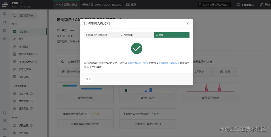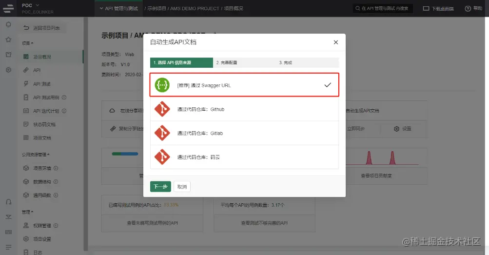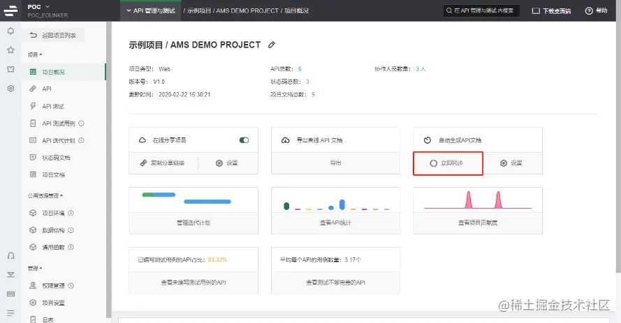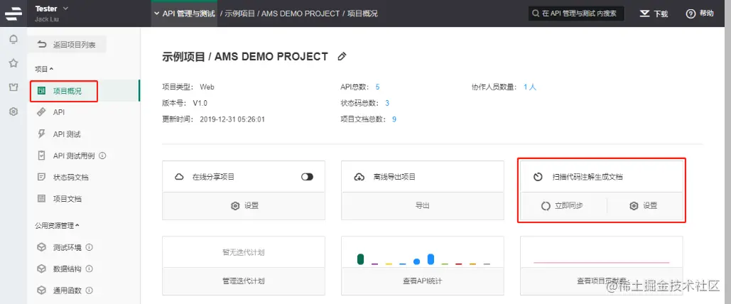 2、进入API管理和测试模块,新建项目后可以在项目概况中看到自动生成文档的设置选项。