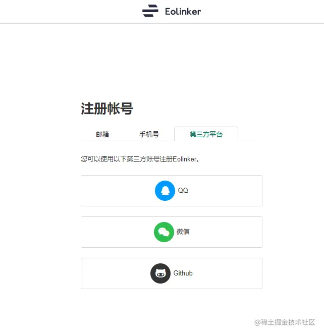 1、登录www.eolinker.com,点击右上角进行免费注册,可以使用第三方平台快速注册登录服务,简单快捷。