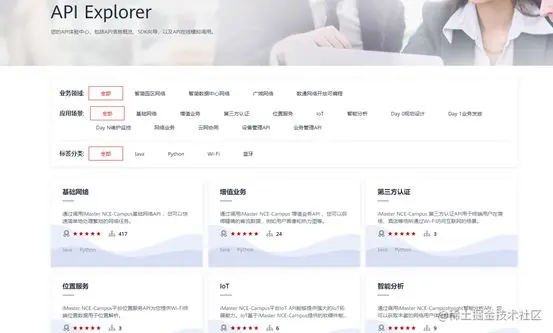 1.4、“知识中心”包括API Explorer,探索,视频教程,学习教程,智简园区网络生态合作白皮书,合作伙伴认证指导书。“API Explorer”是为智简园区网络开发者提供API体验学习和体验平台,包含了API信息概览、SDK向导、以及API在线模拟调测等;“探索”基于行业应用场景,探索和演示使用华为CloudCampus API构建的解决方案,并展示商业案例等;“视频教程”通过视频了解华为CloudCampus应用场景和操作指导;“学习教程”提供场景化的API学习指导和调用示例;“智简园区网络生态合作白皮书” 了解华为智简园区网络解决方案的开放性和增值业务,以及其在行业中应用。“合作认证指导书”了解如何成为华为合作伙伴,以助力业务合作。
