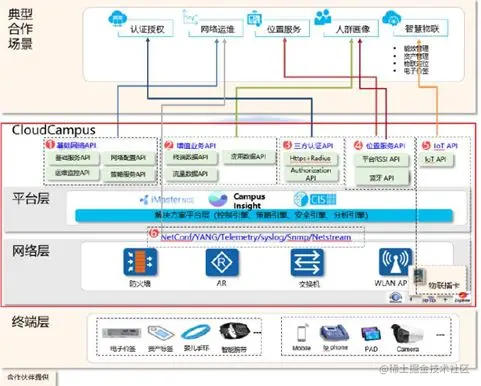 华为智简园区网络(CloudCampus)解决方案,应用前沿的有线和无线技术,加持大数据、AI和云技术,以业务为中心,构建万物互联、业务无忧和可平滑演进的园区网络,使能行业数字化转型。基于5大类430+开放的API接口,华为智简园区网络解决方案面向行业构建开放的架构,帮助客户使能数字化的行业园区网络。华为智简园区网络生态全景图: