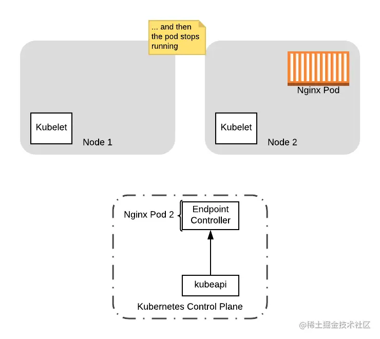 kube-proxy守护程序将从 iptables 中删除 Pod的 IP 地址。 - 端点控制器将从有效端点列表中删除该 Pod,反映到我们这个例子中来就是从 Service 管控的端点(endpoint)列表中移除这个 Pod 端点。