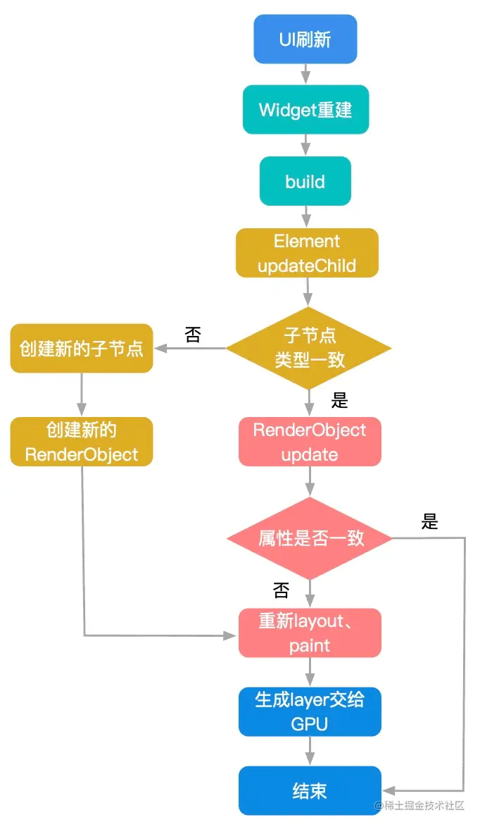 复用 Element 对性能非常重要,因为 Element 拥有两份关键数据:Stateful widget 的状态对象及底层的 RenderObject。当应用的结构很简单时,或许体现不出这种优势,一旦应用复杂起来,构成页面的元素越来越多,重新创建 3 棵树的代价是很高的,所以需要最小化更新操作。当 Flutter 能够复用 Element 时,用户界面的逻辑状态信息是不变的,并且可以重用之前计算的布局信息,避免遍历整棵树。