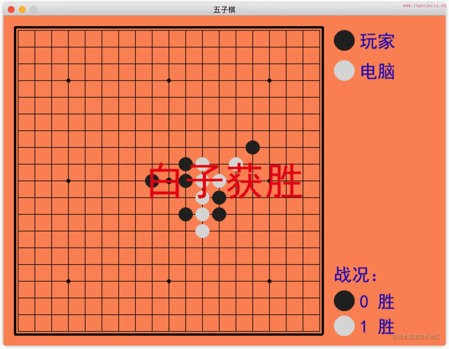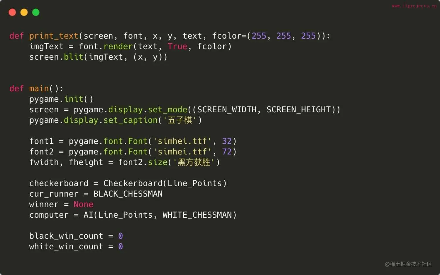 人机对战版五子棋 王老师_10余年编程老师 2021-03-17 216 阅读1分钟 使用pygame实现的经典游戏人机对战五子棋,电脑能够自动下棋 一、运行效果 二、部分示例代码 完整代码以及素材下载地址 www.itprojects.cn/193.html