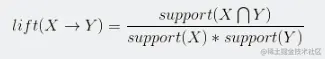 提升度:为了判断产生规则的实际价值,即使用规则后商品出现的次数是否高于商品单独出现的评率,提升度和衡量购买X对购买Y的概率的提升作用。如下公式可见,如果X和Y相互独立那么提升度为1,提升度越大,说明X->Y的关联性越强