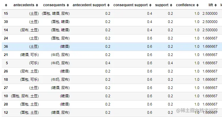 from mlxtend.frequent_patterns import association_rules # metric可以有很多的度量选项,返回的表列名都可以作为参数 association_rule = association_rules(frequent_itemsets,metric='confidence',min_threshold=0.9) #关联规则可以提升度排序 association_rule.sort_values(by='lift',ascending=False,inplace=True) association_rule # 规则是:antecedents->consequents\