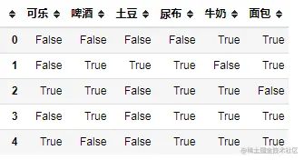 import pandas as pd item_list = [['牛奶','面包'], ['面包','尿布','啤酒','土豆'], ['牛奶','尿布','啤酒','可乐'], ['面包','牛奶','尿布','啤酒'], ['面包','牛奶','尿布','可乐']] item_df = pd.DataFrame(item_list) -
