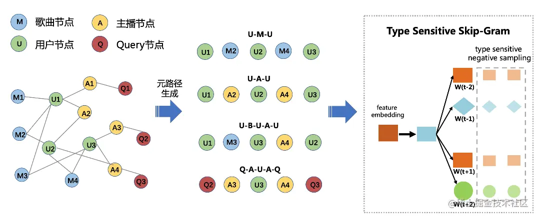 然后,基于飞桨图学习框架 PGL对图模型进行训练。先采用 DeepWalk、Metapath2Vec、GraphSage等模型学习出足够强大的Graph Embedding表示来建模实体ID;再通过向量召回,将用户在歌曲、Query等处的行为迁移到主播领域,达到召回合适主播的目的。