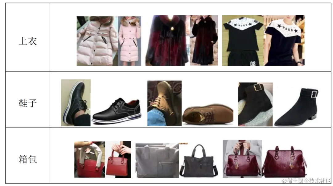 给定一个大规模时尚单品的电商展示图集合 ,其中每个时尚商品都属于{上衣,鞋子,箱包}中的某一类。对于任意一张时尚单品的用户实拍图 都存在一个与之相匹配的电商展示图集合 。