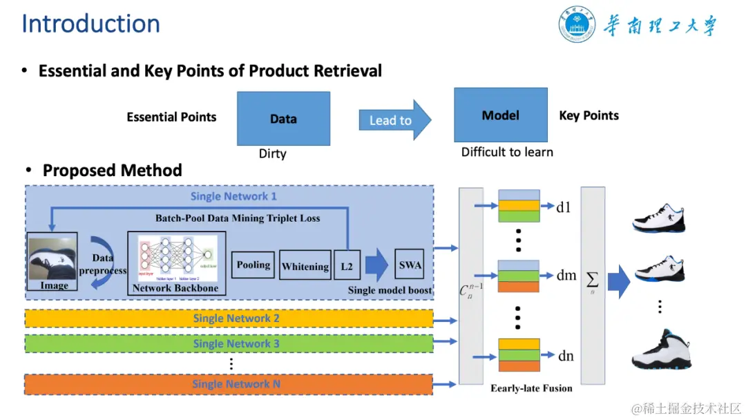 时尚单品搜索是在线商城业务的重要支柱。通过分析用户拍摄的时尚单品照片,在庞大的时尚单品数据库中高精准、高效率地检索出与之相对应的商品是一项拥有广阔应用场景的技术,能够助力拍照购物、个性化推荐、广告点击预测等多项人工智能产品。同时,查询图像中商品的角度、光照、遮挡、尺寸、质量等都为本问题带来巨大挑战。