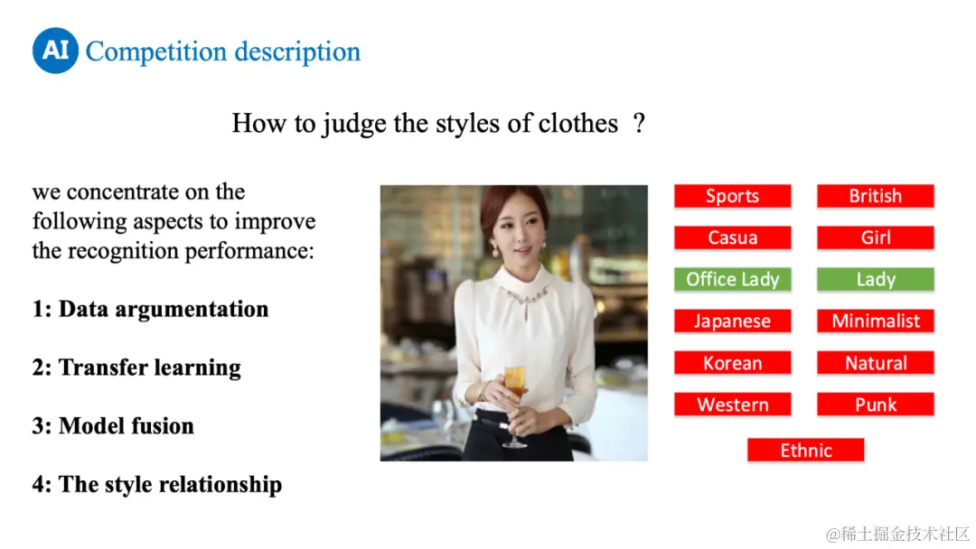 服饰风格的判断因为很强的专业性,是时尚结合 AI 领域最有难度的多标签分类任务之一。本次竞赛邀请了专业时尚设计界人士,在其指导下标注了接近 6万5千张京东的女装商品照片的整体时尚风格,专注如何利用 AI 识别服饰的时尚风格。