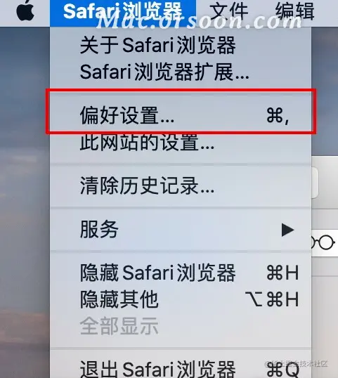 1.选择Safari 浏览器的「偏好设定」。