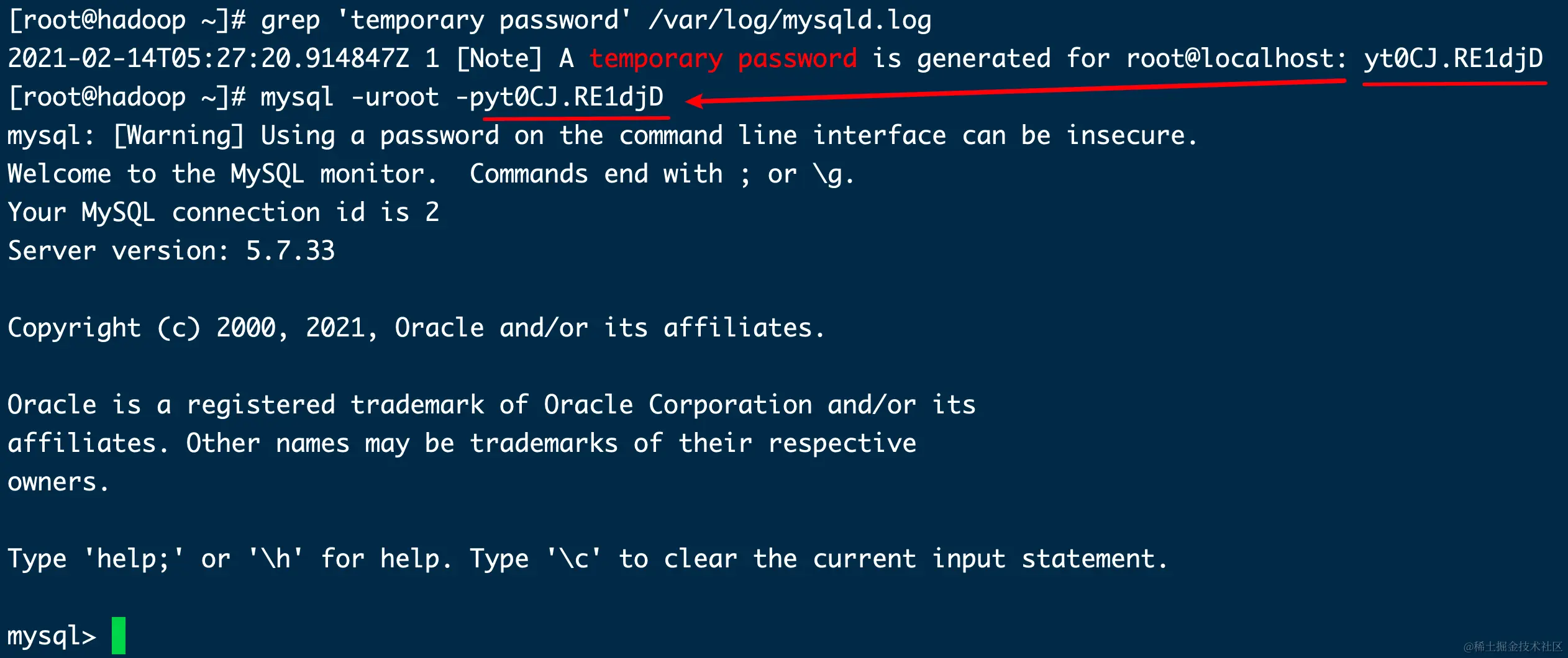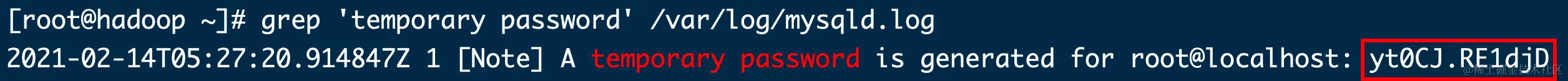 MySQL在启动后会产生一个日志文件,存放在 /var/log/mysqld.log ,其中包含了初始密码的信息,可以通过以下命令快速找到: