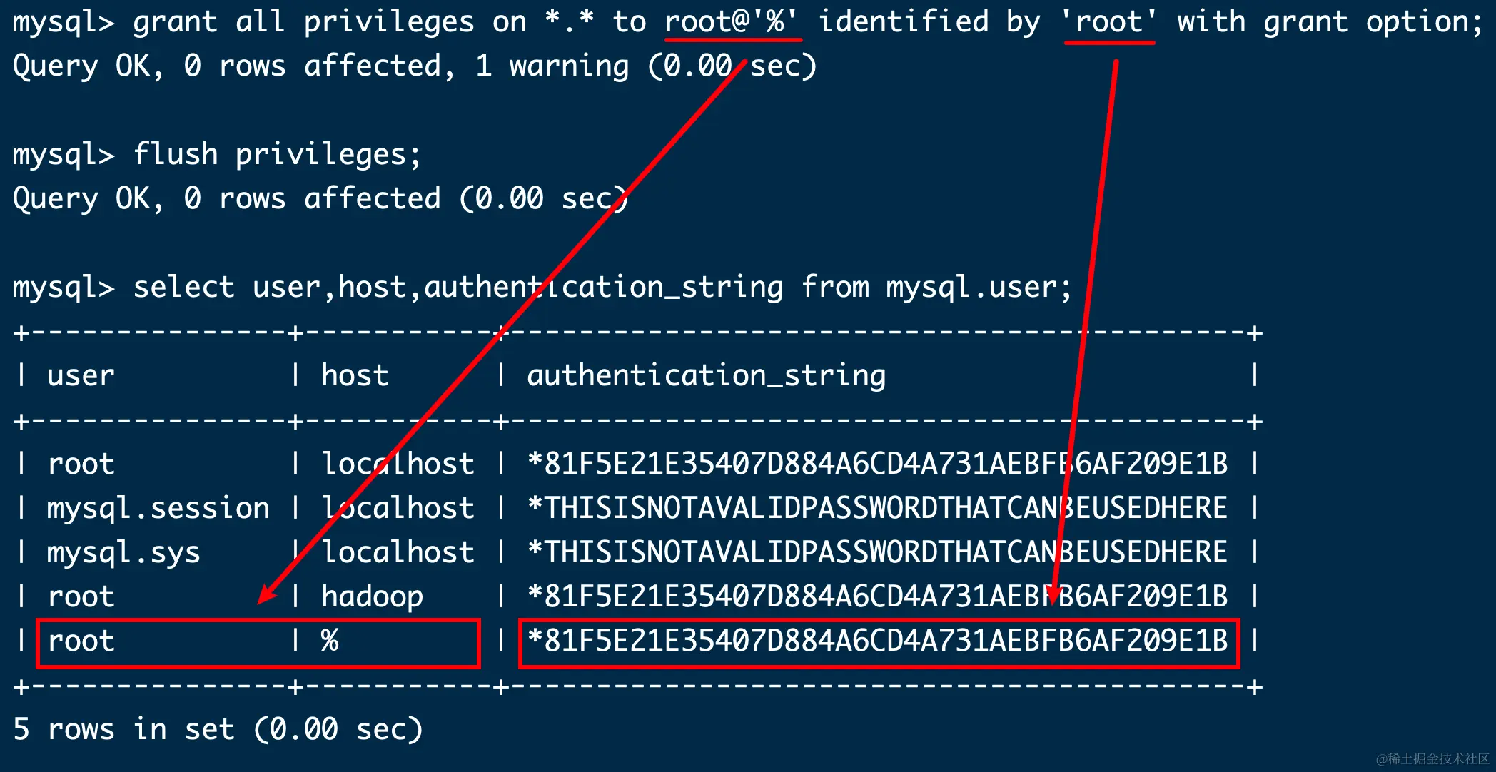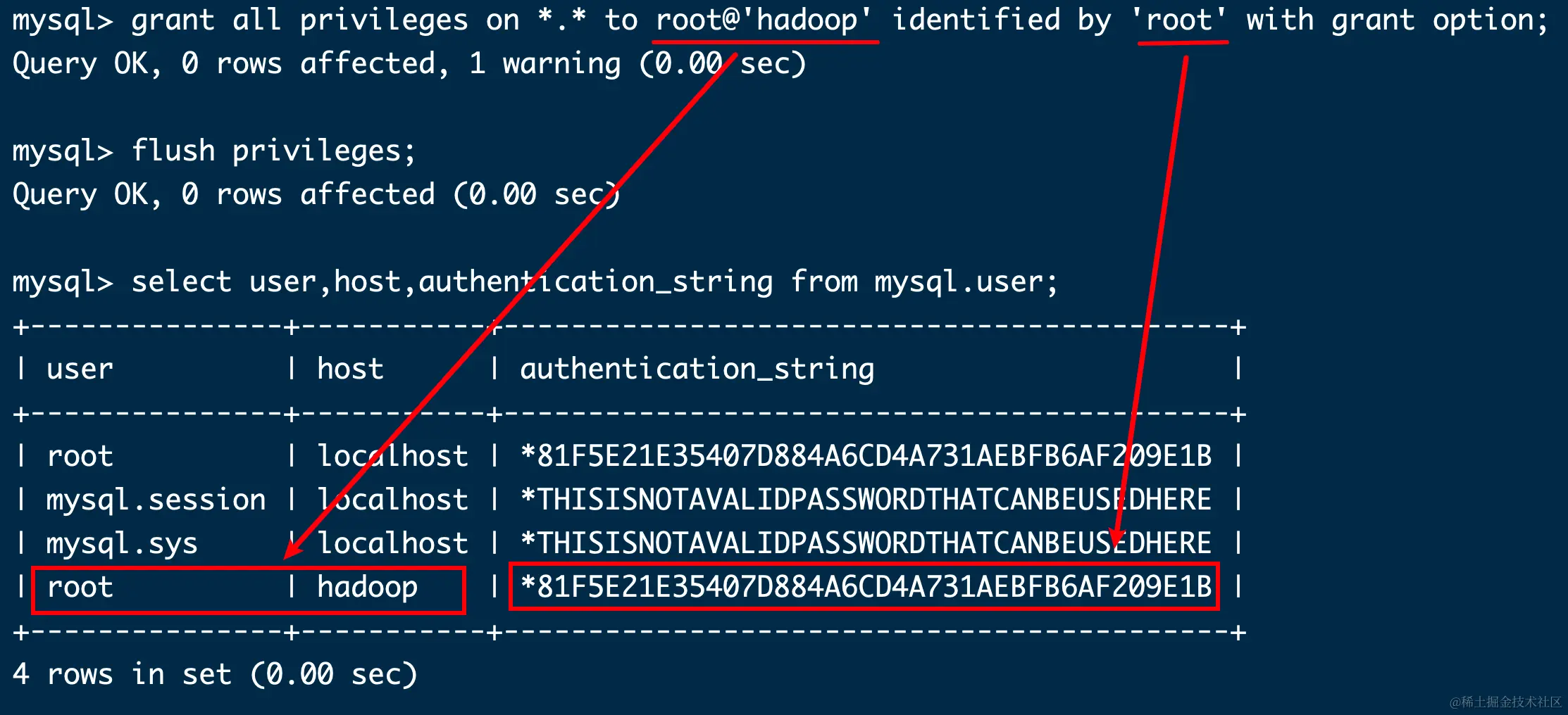 grant all privileges on *.* to root@'hadoop' identified by 'root' with grant option;