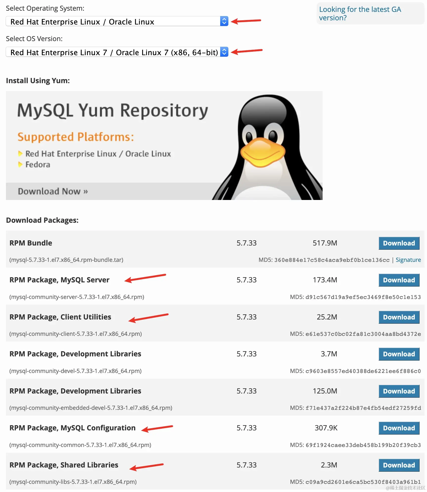 对于Linux平台而言而言,如果是解压安装基本没有任何差别。如果是软件包安装,在下载时一定要选择相应的版本。目前官网提供两个大的稳定版,一个是5.7,一个是8.0,本文将演示如何在CentOS 7系统下安装MySQL 5.7。