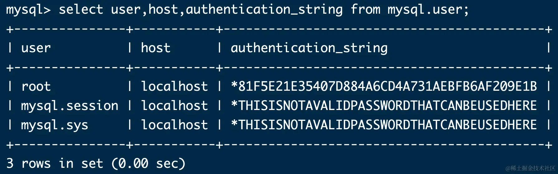 select user,host,authentication_string from mysql.user;