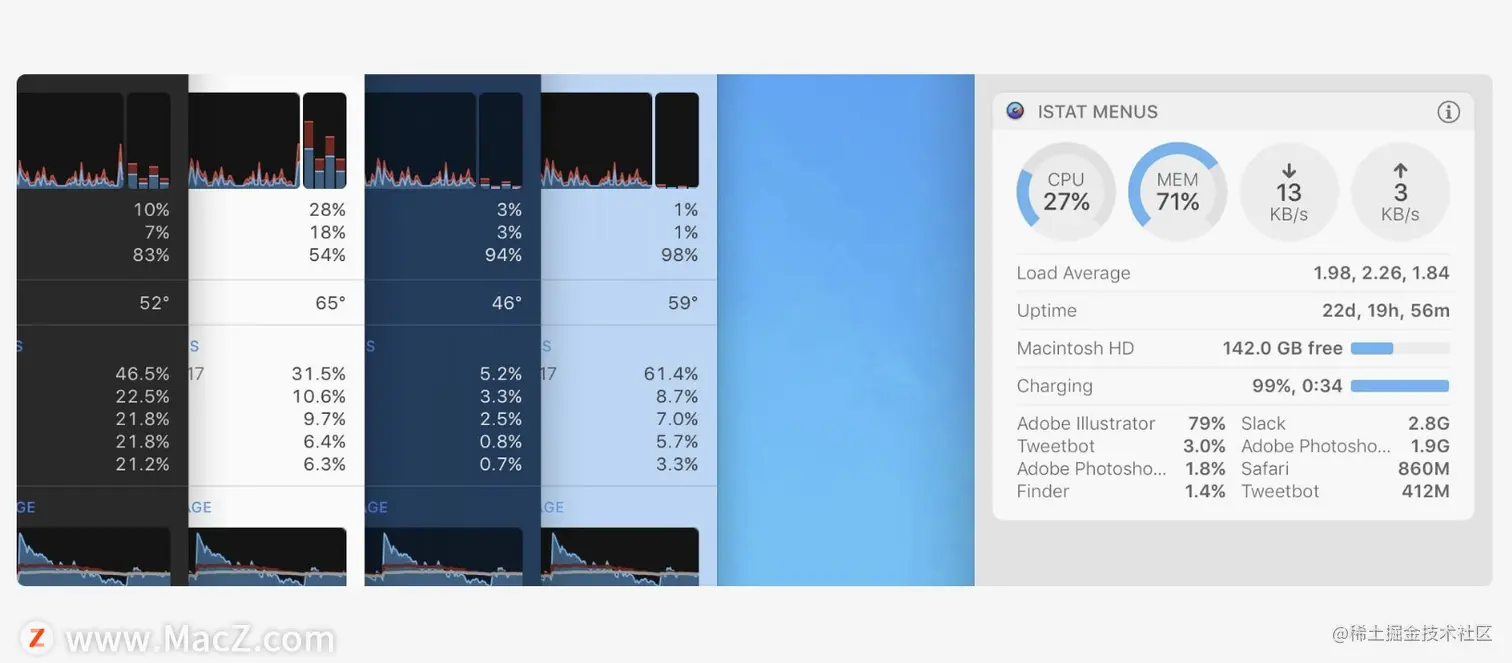 如果今天想快速列出目前电脑的CPU 或是记忆体的使用状况,或是想观察哪些进程吃掉电脑太多资源。iStat Menus是一个不错的选择,它提供的信息包括 CPU 使用情形、内存用量、硬盘使用情形、网络传输、机器温度、风扇转速等等。应用可以让你监测系统的各项丰富资讯,又不会占用使用者太大的桌面空间。