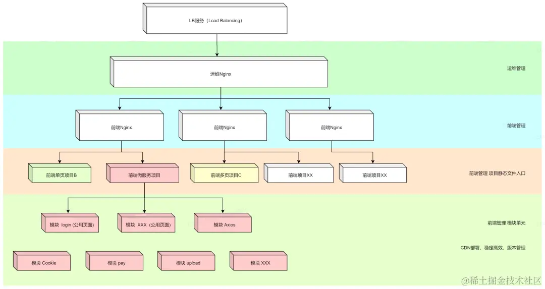 新架构流程,把改为运维 Nginx 符合规则的部分访问转发到前端 Nginx 服务,前端 Nginx 配置相应的地址以及访问资源,前端则和一般 spa 项目开发的路由一致。