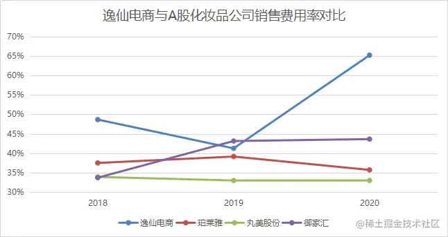 2020年,完美日记的营销费用34.12亿,同比增长172%,远高于73%的收入增速,2020年,完美日记营销费用率为65.20%,较2019年的41.27%提高23.93个百分点。