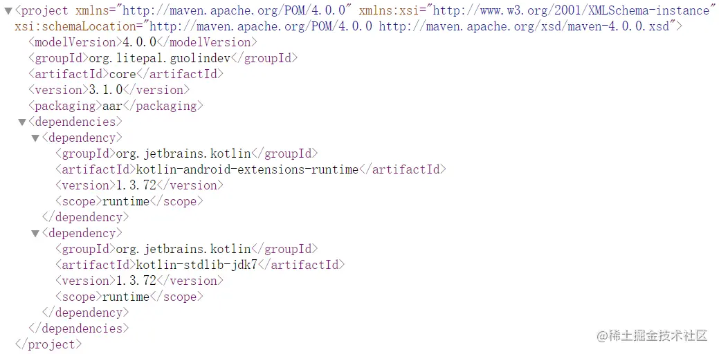 可以看到,这里在 dependencies 当中声明了 LitePal 是需要依赖 Kotlin 的一些运行时库的,如果你当前的项目中没有这些库(比如是使用 Java 开发的项目),那么 Gradle 会自动将这些依赖下载下来,以保证 LitePal 可以正常运行。