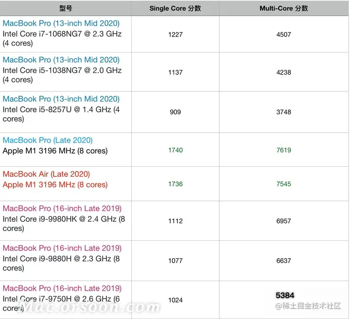 可以看到,M1芯片,非常的强悍,MacBook Air和MacBook Pro 13英寸配备的M1芯片无论是单核还是多核遥遥领先,甚至超过16英寸的MacBook Pro;