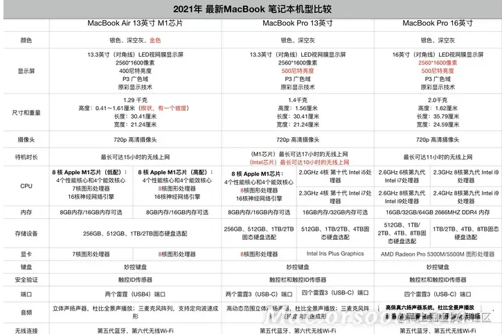 上表列出了2021年MacBook Air M1版本和 MacBook Pro 13英寸(M1版本和Intel版本)、16英寸(Intel版本)的详细配置图。