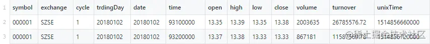 columns=`symbol`exchange`cycle`tradingDay`date`time`open`high`low`close`volume`turnover`unixTime