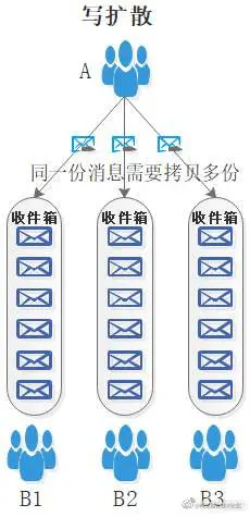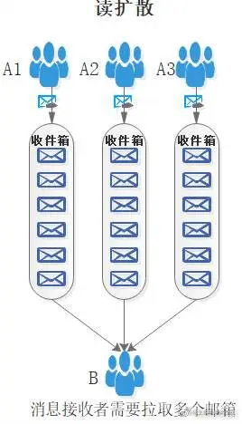 如上图所示,用户B与每个聊天的人(A1,A2,A3)都有一个信箱(一种数据结构的抽象,用于存储消息),B在查看聊天信息时需读取所有有新消息的信箱。IM系统里的读扩散通常是每两个相关联的人就有一个信箱。