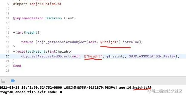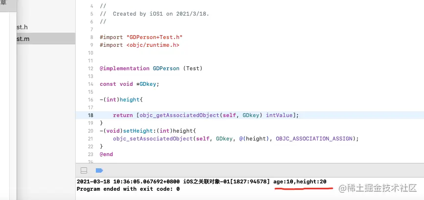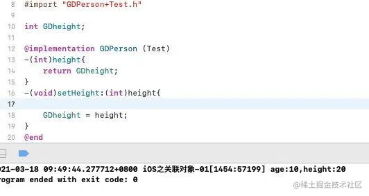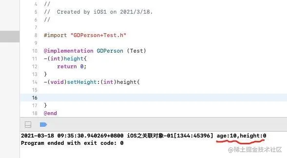 我们知道,在GDPerson中的age它是系统给我们生成了3个:成员变量;get方法;set方法,而Test分类中声明了一个height的属性,我们先看一下程序的运行: