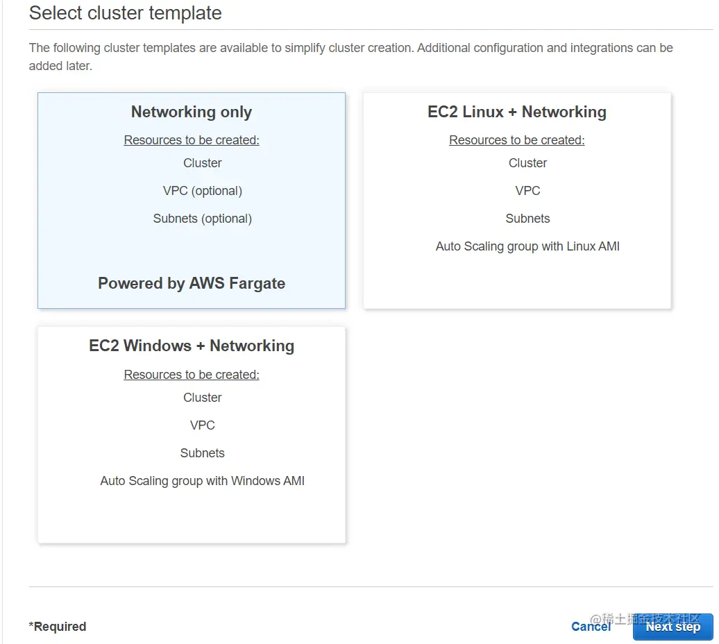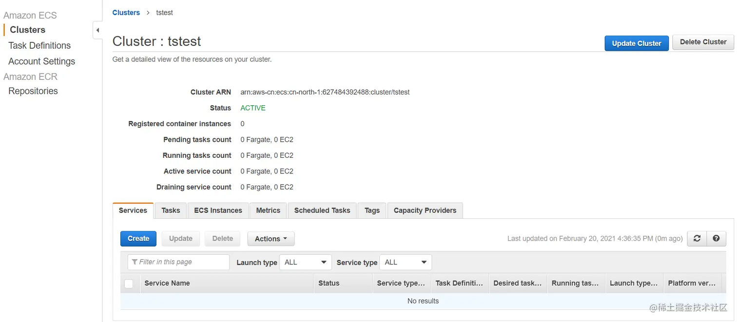 登录AWS中控台选择Elastic Container Service进去ECS界面,点击"Create Cluster"