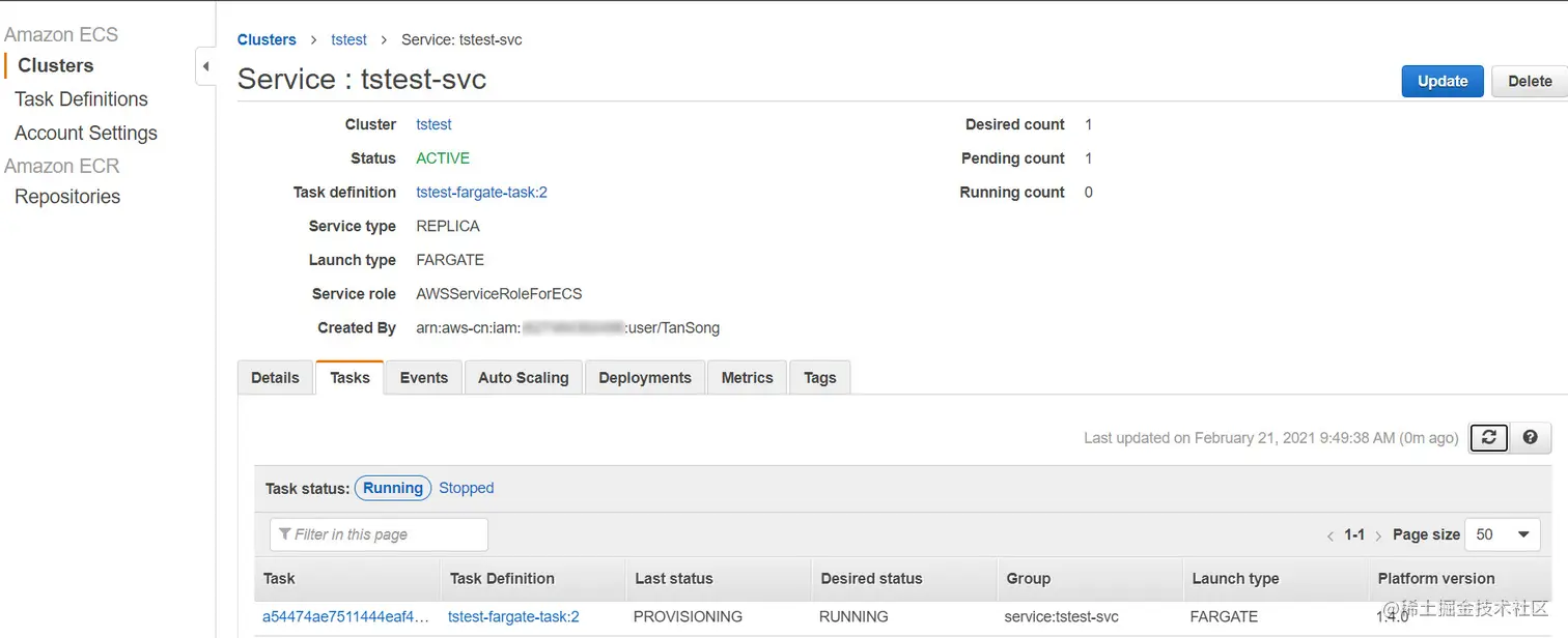 点击"tstest-svc"可以查看service中task的运行情况。先是provisioning经pending,最后是running