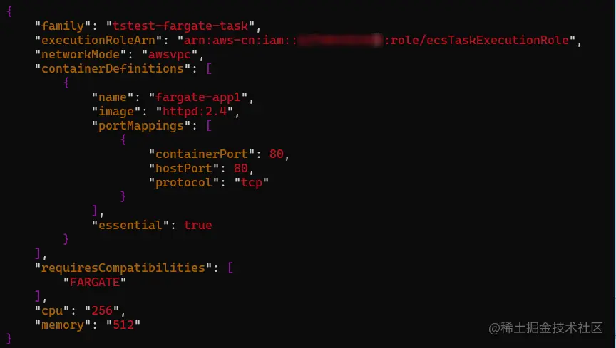 - "executionRoleArn" :任务执行角色的ARN,该角色授予 Amazon ECS 容器代理进行 AWS API 调用的权限