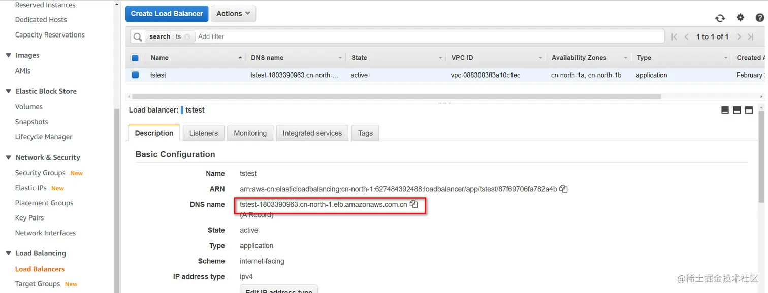 ALB创建需要一点时间provisioning,过一会儿可以看到创建成功。DNS name就是我们之后用来访问的地址