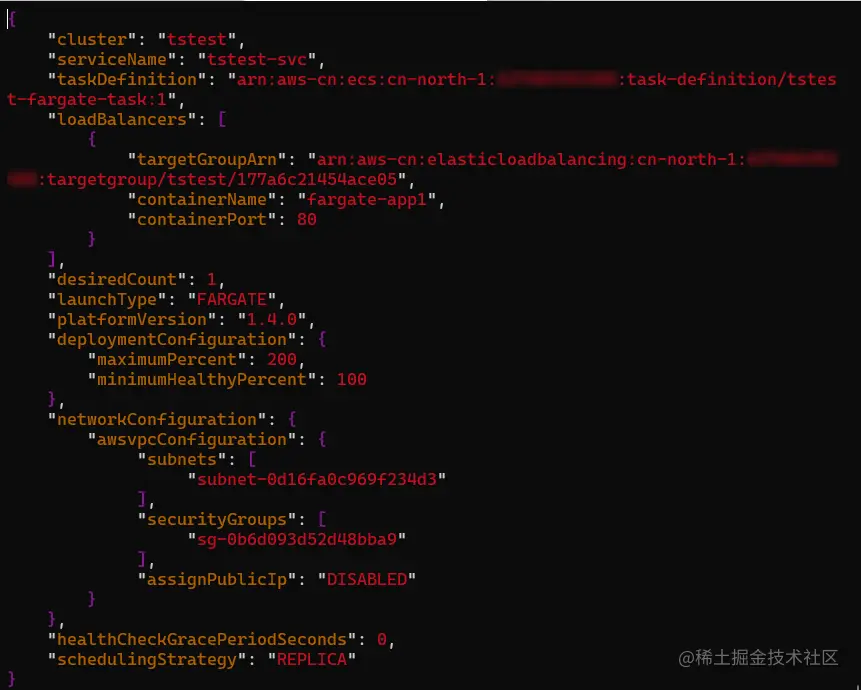- "loadBalancers" :配指定容器注册到target group中的端口,这里把容器fargate-app1的的80端口注册到了"tstest"这个target group中
