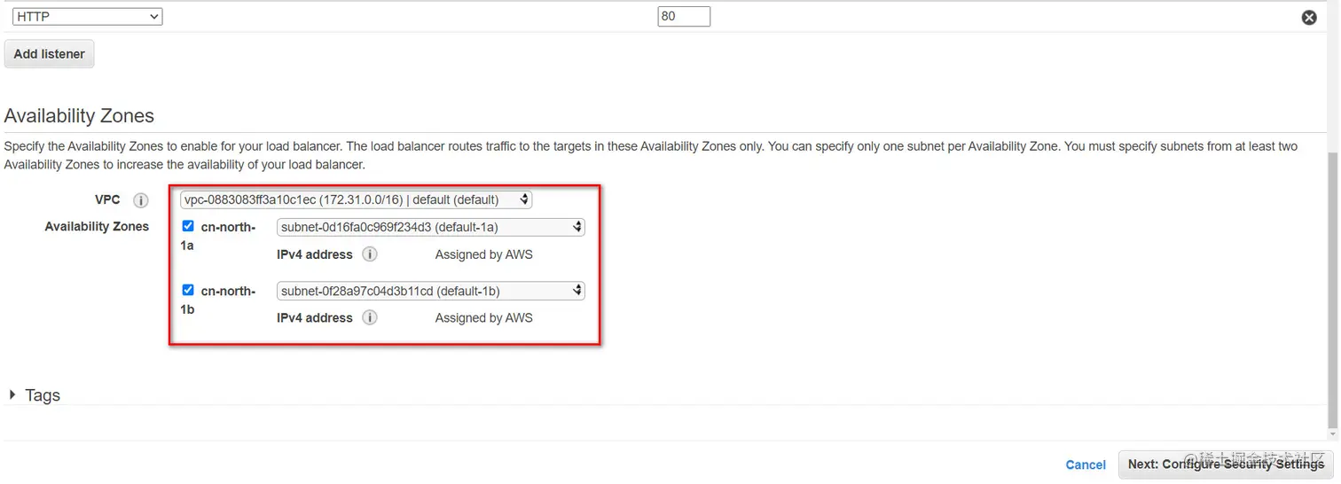 选择ALB所在的VPC和subent,至少选择两项。因为要从internet访问所以要选择public subnet,点击Next