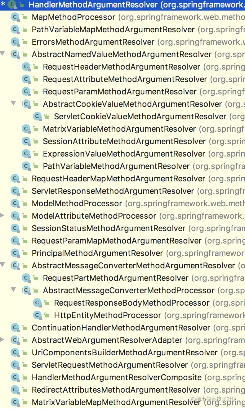 HandlerMethodArgumentResolver 就是我们口口声声说的参数解析器,它的实现类还是蛮多的,因为每一种类型的参数都对应了一个参数解析器: