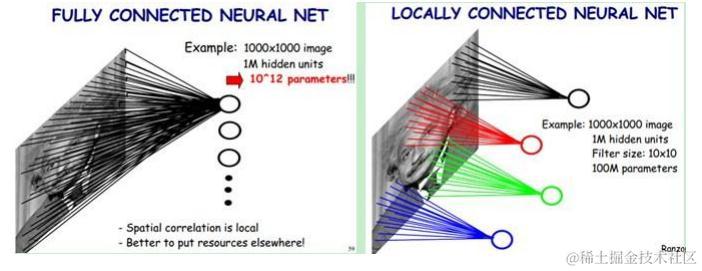 1.全连接,权值太多,需要很多样本去训练,计算困难