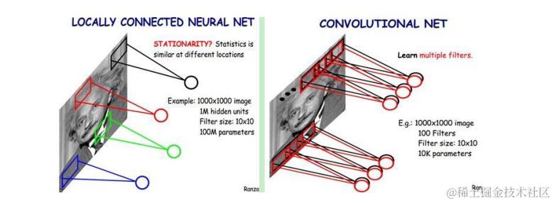 第一种神器叫做局部感知野,一般认为人对外界的认知是从局部到全局的,而图像的空间联系也是局部的像素联系较为紧密,而距离较远的像素相关性则较弱。因而,每个神经元其实没有必要对全局图像进行感知,只需要对局部进行感知,然后在更高层将局部的信息综合起来就得到了全局的信息。