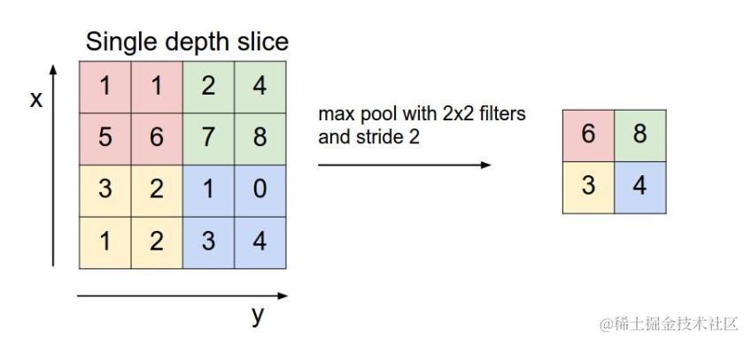 对于每个2*2的窗口选出最大的数作为输出矩阵的相应元素的值,比如输入矩阵第一个2*2窗口中最大的数是6,那么输出矩阵的第一个元素就是6,如此类推。