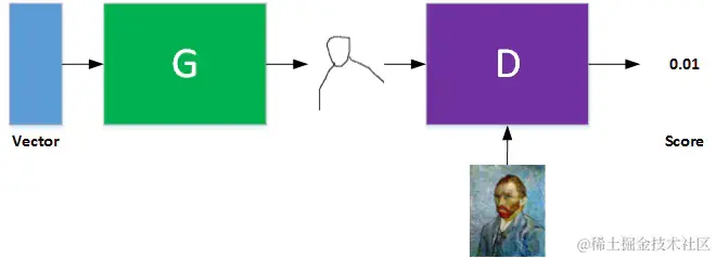 GAN 基本模型由 输入 Vector、G 网络、D 网络组成。其中,G 和 D 一般都是由神经网络组成。G 的输出是一幅图片,只不过是以全连接形式。G 的输出是 D 的输入,D 的输入还包含真实样本集。这样, D 对真实样本尽量输出 score 高一些,对 G 产生的样本尽量输出 score 低一些。每次循环迭代,G 网络不断优化网络参数,使 D 无法区分真假;而 D 网络也在不断优化网络参数,提高辨识度,让真假样本的 score 有差距。